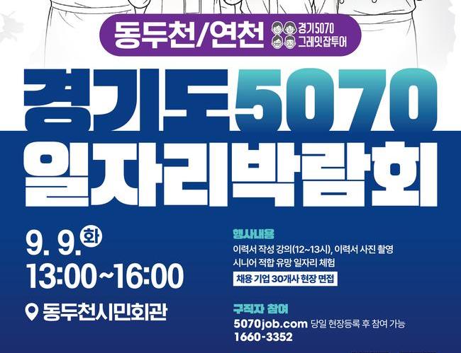 6. `경기도 5070 일자리박람회` 동두천, 연천에서 만나요 경기도와 경기도일자리재단은 오는 9일 동두천시민회관에서 `2025 경기도 5070 일자리박람회 in 동두천+연천`을 개최한다.박람회는 도내 50∼70대 중장년층의 재취업을 지원하기 위한 시군 순회형 박람회로, 구인·구직 기회가 상대적으로 적었던 북부의 소규모 시군에서 열려 지역 기업과 중장년 모두에게 새로운 기회의 장을 마련하고자...